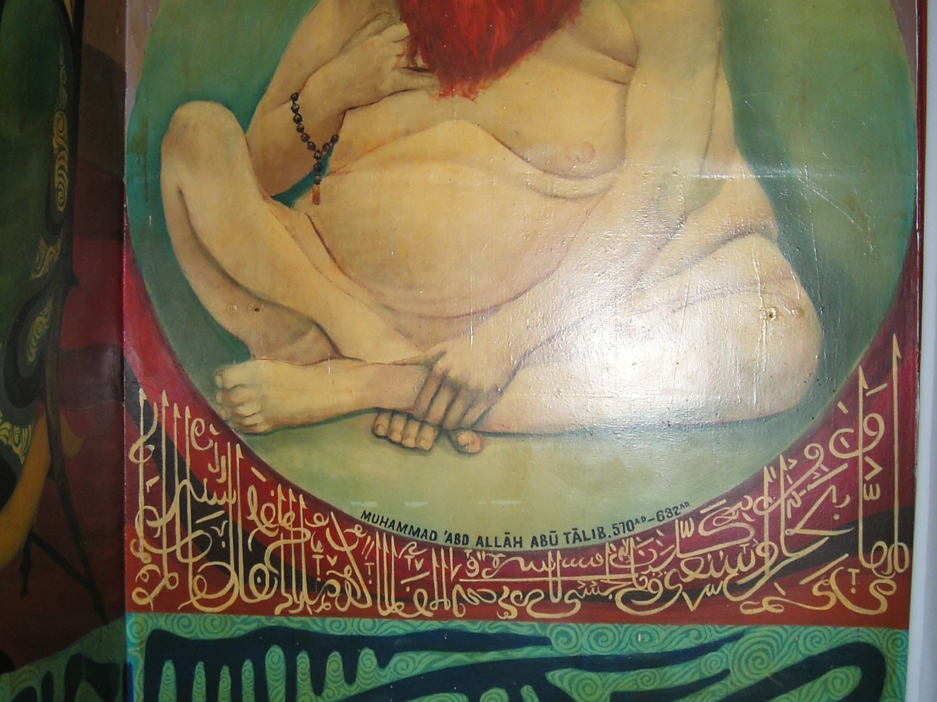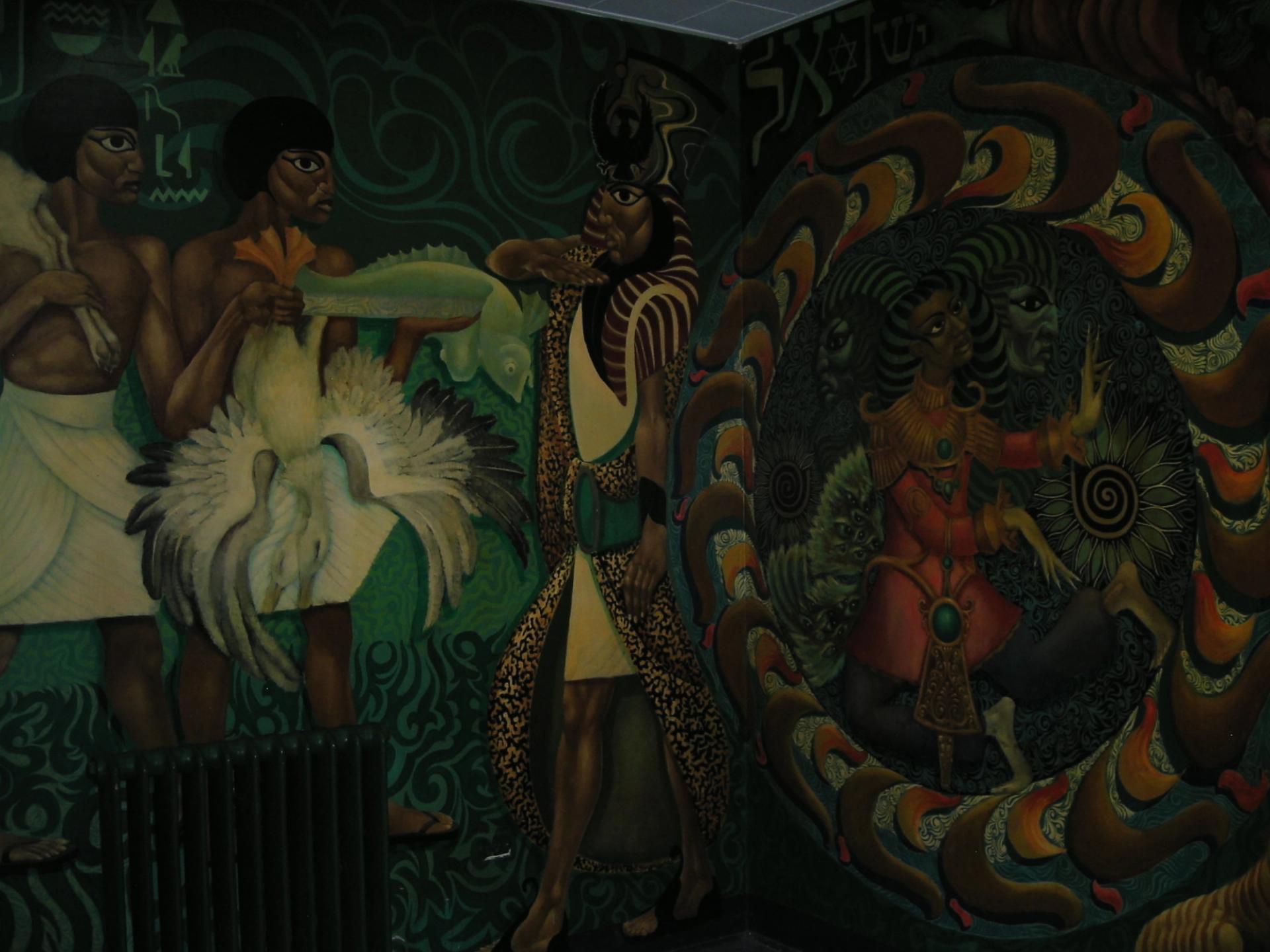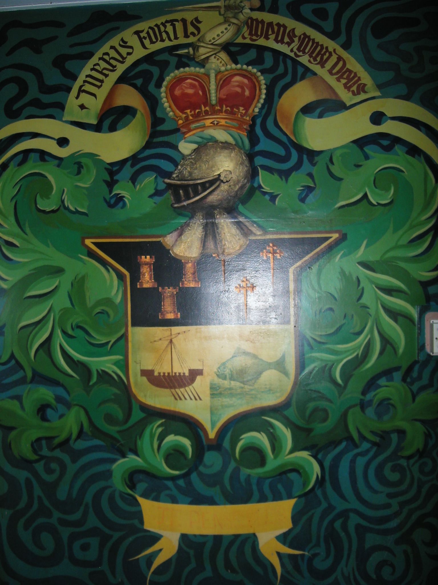 Google Translating Latin in a defunct wing at a psychiatric centre in West Sydney. It occurred to me that in a problematic but distant season of my life, it wasn’t an outrageous prospect that I would be in a room similar to this one. I am in a dark air-conditioned section of the heritage-listed ‘Ward 8’, examining a floor-to-ceiling mural that circumnavigates the entirety of the wall space in this room. The work, at first, feels fanatic. An excursion into religion, all its godheads, versions and failings. Egyptian sacrifice on one wall, then Greco-Roman nymphs, Islamic prophets, and Indigenous Lore. Light distends around the room. A cute disclaimer plaque tries to prepare you for it all at the front door. In the far right corner of this mural, a glinting coat of arms is painted. The symbol is dark green, with castles and swords, and an armoured elbow emerges from the metal cranium of a medieval helmet. It’s wielding a dagger. A golden ribbon above the crest reads in faded lettering, ‘Turris Fortis Mihi Deus’, God is my strong tower.