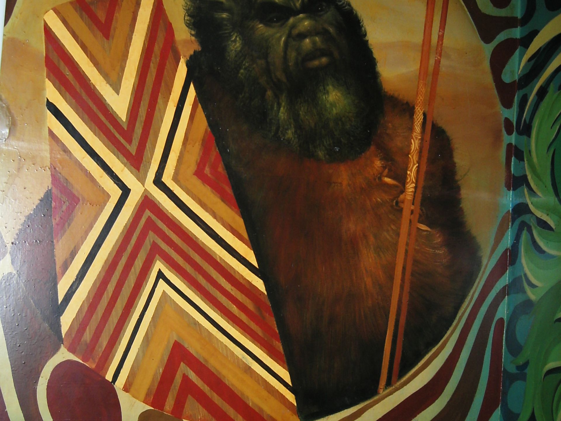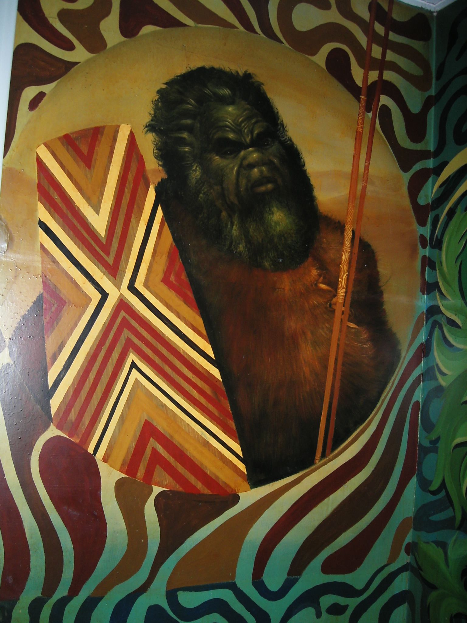 I rolled off the Hume highway, deranged by the heat. The Toyota I was driving had no aircon, and two of the windows didn’t roll down. At one point, I was pouring water down the back of my neck to feel it evaporate off my skin. The temperature topped 41 degrees in those intervening hours. In the evening the hills looked like suede. Then it was dark, and I was buying tins of Bundy colas in an air-conditioned pub. They weren’t for me, they were for the tradie sitting next to me called Ian. The particular bar we were drinking in had the faces of bush rangers peering at us from every wall, gunpowder firing, pinstriped convicts fleeing moustachioed policemen. Captain Moonlite, his ‘friend’ James Nesbitt, and the Kellys fly around us, a paranormal fresco. Open warfare. Very different from Nolan’s boys. Arnold painted this bar in the late sixties, it is just one of two obscenely large areas in the pub completed by him. He did it for free beer, room and board and refused to start painting until he was drunk.