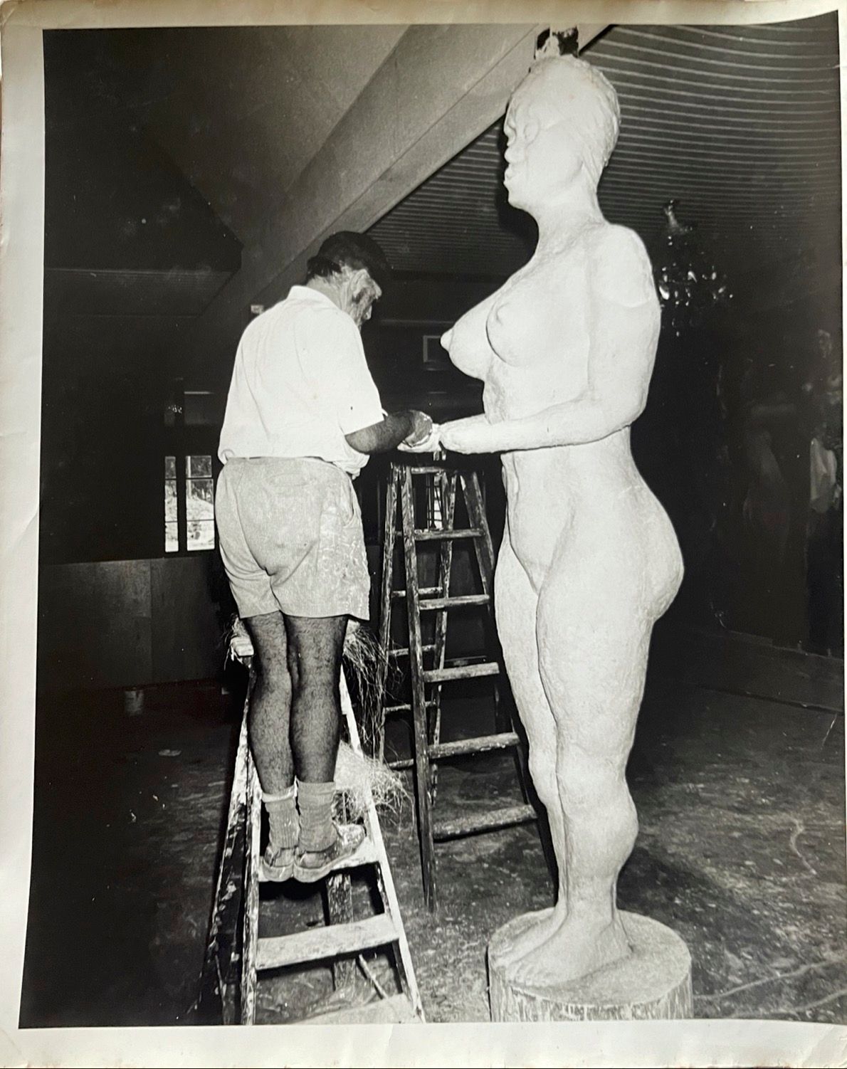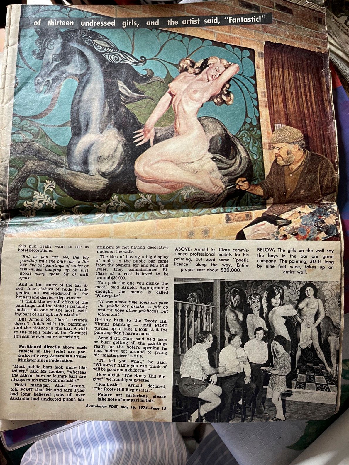 ‘If you’d left it a little bit longer, I wouldn’t be here.’ Insinuating a joke about her age, Corrina Killeen sat across from me, our chairs angled towards each other; we spoke over a slanted mountain of newspaper clippings and photo albums. I recoiled at that statement, calling it divine timing to which she smiled. A great smile. A great voice. The truth is that I could not focus on these important things in front of me - her grin, the Tooheys (bitter), the articles, without compulsively averting my eyes toward the walls of her house. They are covered in art. Canvases lean on each other in hallways, murals peel from orange walls in her light-filled kitchen, and the bathroom door bears the delicately painted figures of Adam and Eve, mischievous, dancing and strategically-leafed. It seems to me now that I had gotten used to feeling almost there - like I had only just missed out. I had scraped the most obscure and tangential threads to chase down leads for months, only to come up dry. A dead-end. A no-comment. A lick of gossip. I had been existing in that grey area between ‘on time’ and ‘too late’, scouring Google street view and community Facebook noticeboards. This grey area is a triumphant chasm in which information gets lowered six feet, forgotten or generally evaporates into the ether. Against all natural conspiracies to stifle this piece of writing, and against the inertia of time, somehow, I had found the crucible. It had been in Campbelltown this whole time. Just as important as who was in the home was who wasn’t - Arnold and Claire. The two fixed stars of this story are gone, but their work was all around us, cladding the walls like petroglyphs in a subterranean chamber, testimonies of lives lived in art. And Corrina was here, Claire’s daughter.